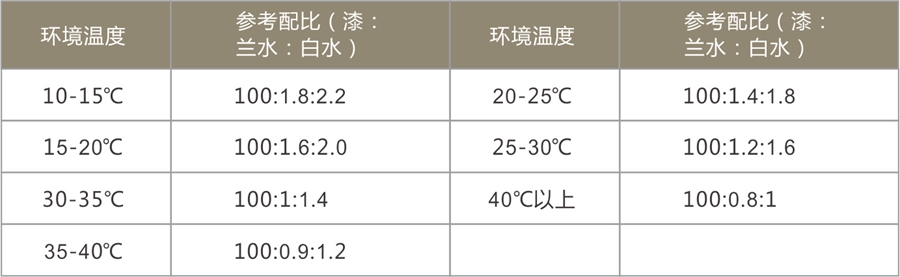 在實際施工中可根據實際情況參考以下配比,相對濕度在75%以下時,配漆為: