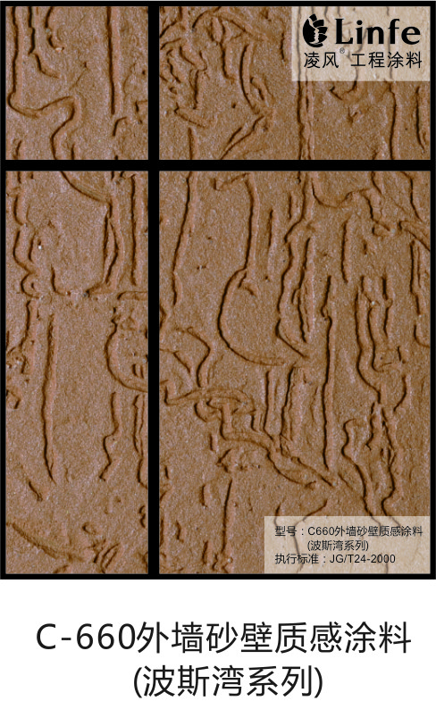 凌風外墻砂壁質感涂料經歷多年不同地域不同氣侯的嚴酷與考驗,色澤依然光鮮如初,以其粗獷豪放、天然淳樸、變幻無窮、立體紋理、一改傳統建筑平面裝飾的呆板單調、成為現代建筑及家庭裝飾設計領域的一款絕佳素材。產品涵括了刮砂型、彈性刮砂型、砂膠型、拉毛型、浮雕型、仿樹皮型、粗砂藝術型等。